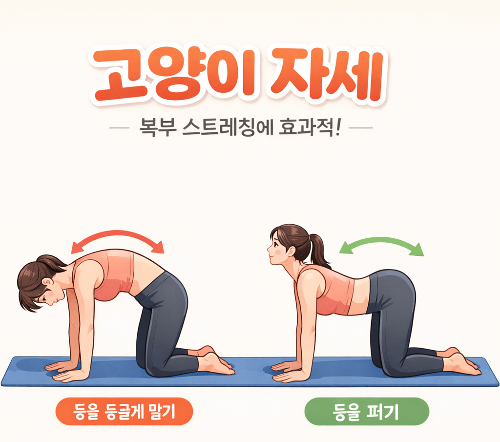 제가 개인적으로 효과를 느꼈던 방법 중 하나가 바로 복부 스트레칭입니다. 특히 요가에서 하는 “고양이 자세”가 도움이 됩니다. 방법은 간단합니다.
